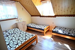 Każda chata posiada trzy pokoje (2 sypialnie i salon), przygotowany na przyjęcie od 2 do 8 osób.