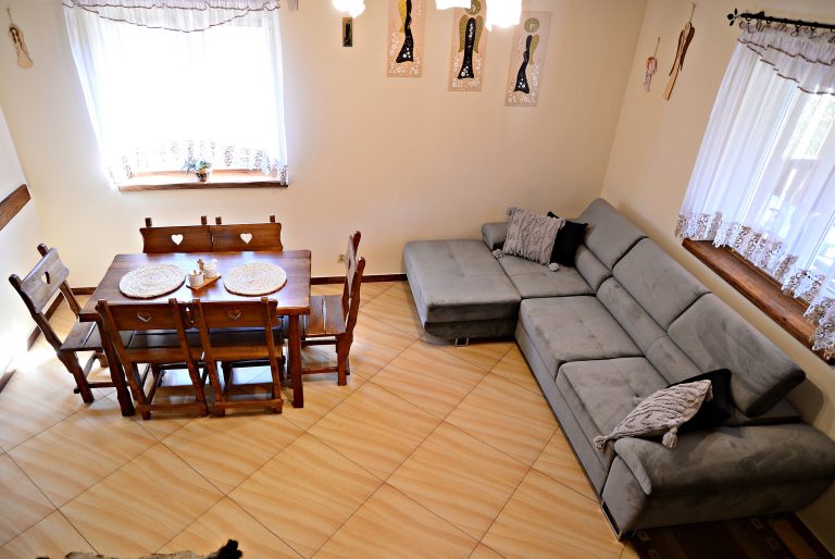 Duży salon z wygodnym rozkładanym narożnikiem i TV 55” oraz kamienny kominek (który ogrzewa cały domek)